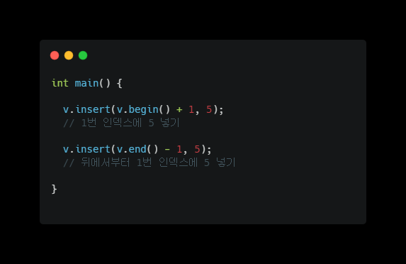 v라는 이름을 가진 vector의 2번 인덱스에 5라는 수를 끼워넣고 싶다고 하자.