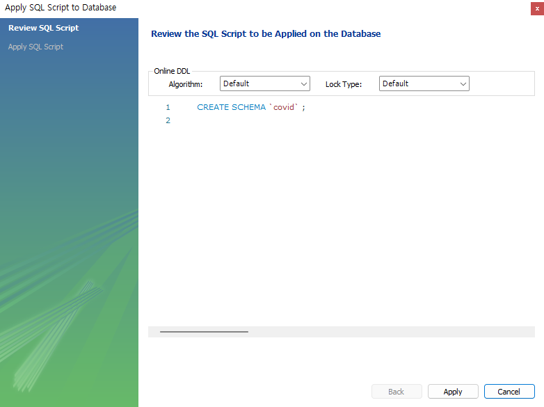 다음 나오는 창에 대해 Apply를 눌러주면 해당 스키마가 생성되게 된다.