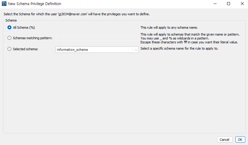 All Schema를 선택하여 해당 사용자가 모든 스키마를 선택할 수 있도록 했다.