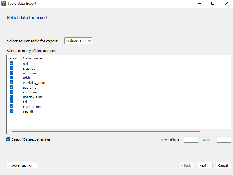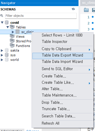 해당 테이블을 오른쪽 클릭하여 Export Wizard를 통해 csv 파일로 내보낼 수 있다.
