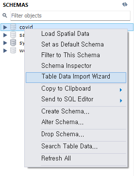 여기서 해당 스키마에 우클릭을 사용하여 데이터를 넣어보도록 하자.