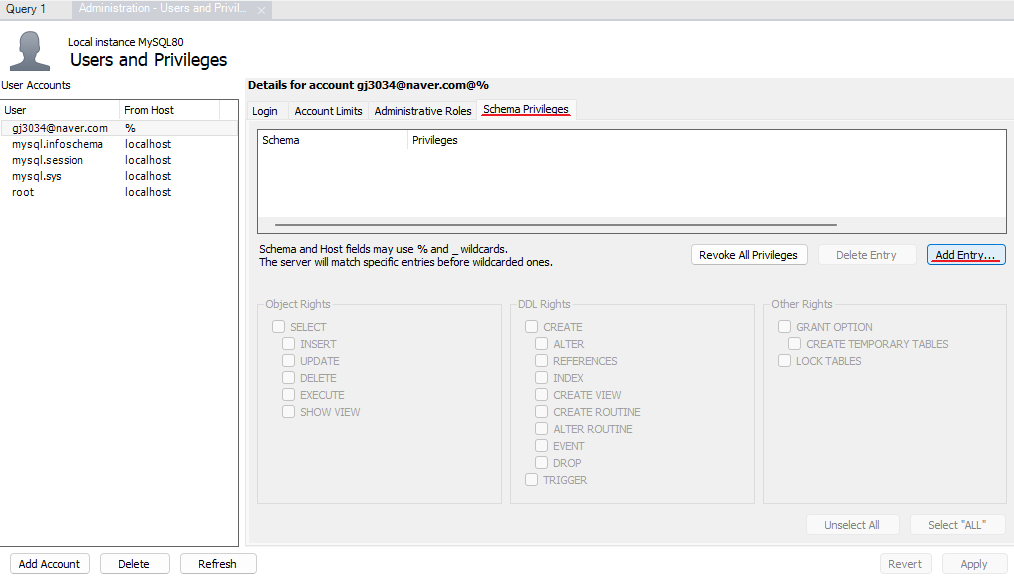 Schema Privileges -> Add Entry...를 누른 후