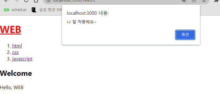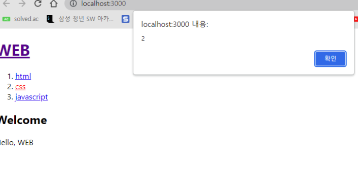 제일 먼저 메인인 WEB을 클릭했을 때, 경고창을 이용하여 특정 문구가 나타나도록 해볼 것이다.