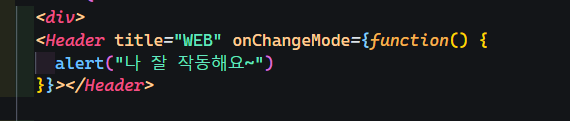 Header 컴포넌트에 onChangeMode 라는 속성을 추가해주었고 해당 속성은 함수로 이루어져 있으며, 작동될 시