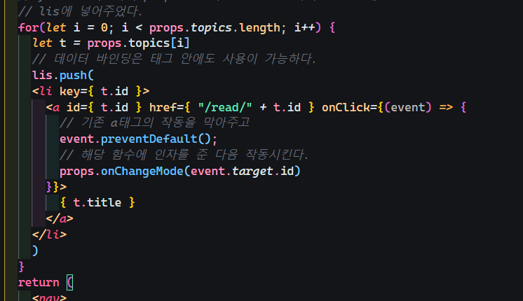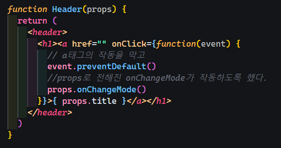 이제 a태그의 작동을 막아주었으니 App의 Header 컴포넌트에 코드를 추가해보자.
