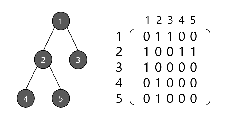 위 그림을 기준으로 아래와 같이 행렬을 이용하여 정점들 간의 관계를 표현한다.